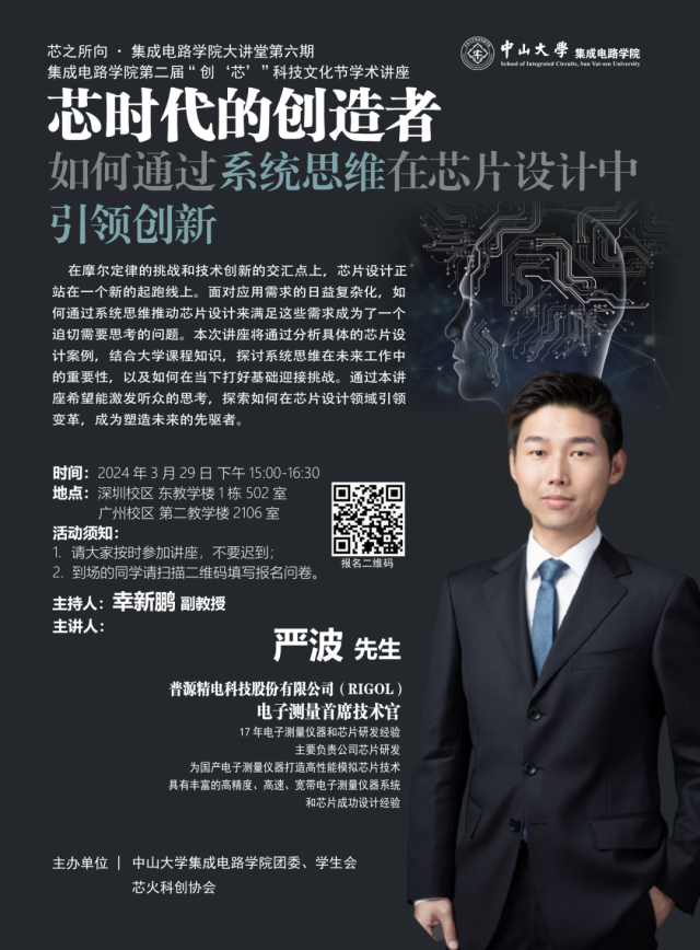 2024年3月29日下午,一场以“‘芯’时代的创造者:如何通过系统思维在芯片设计中引领创新”为主题的科技讲座在深圳校区和广州校区南校园同步举行。