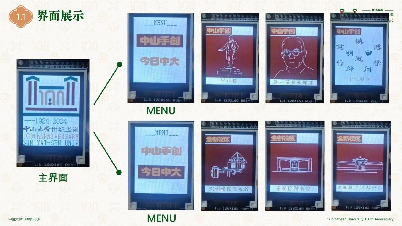 使用stm32主控,连接TFTLCD彩屏和控制按键。设置多级菜单,点阵绘制中山大学百年华诞标识图和集电学子彩绘的中大校园、校训图片等。