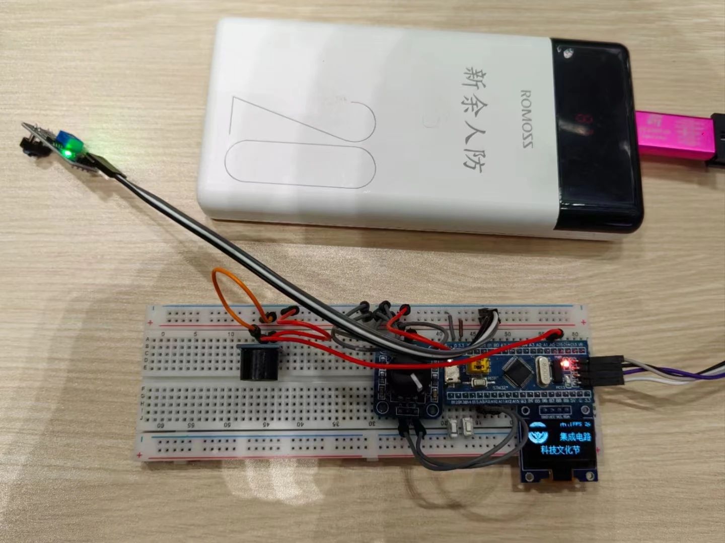 以stm32裸板为主体,辅之以oled显示屏、蜂鸣器、光敏传感器、旋转编码器,具备更换壁纸、校歌播放、动画表演等多种功能。