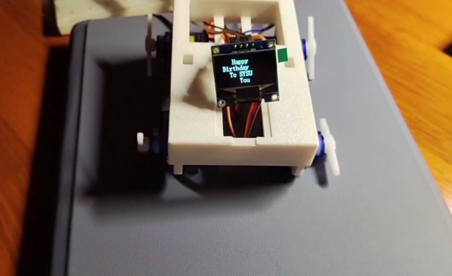 外部搭载显示屏与舵机,实现按既定轨迹运动的同时,滚动播放校庆文字祝福。
