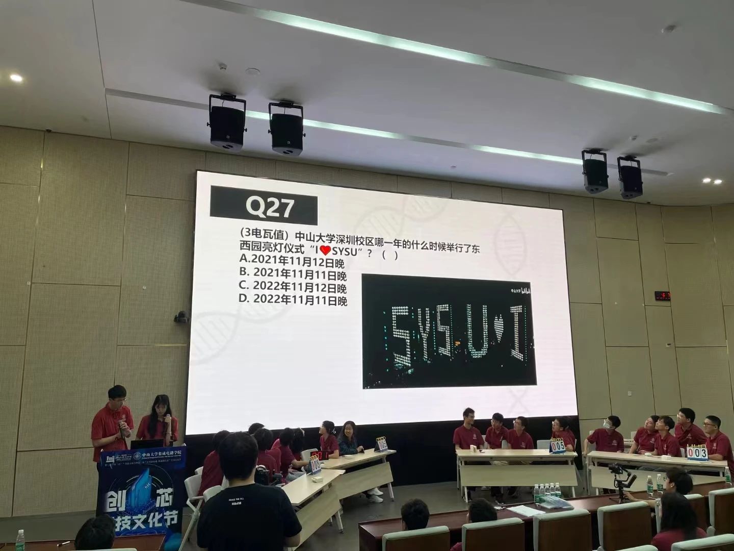 作品展示评比之后是激动人心的创“芯”知识竞答环节。同学们根据入场时领取的不同纪念票分为四队开始比赛。竞答题目包含专业学科知识与校史文化等内容,最终得分最高的队伍收获冠军奖杯和学院文创大礼包。在积极热烈的氛围中,同学们巩固了学科知识并加深了对校史的理解。