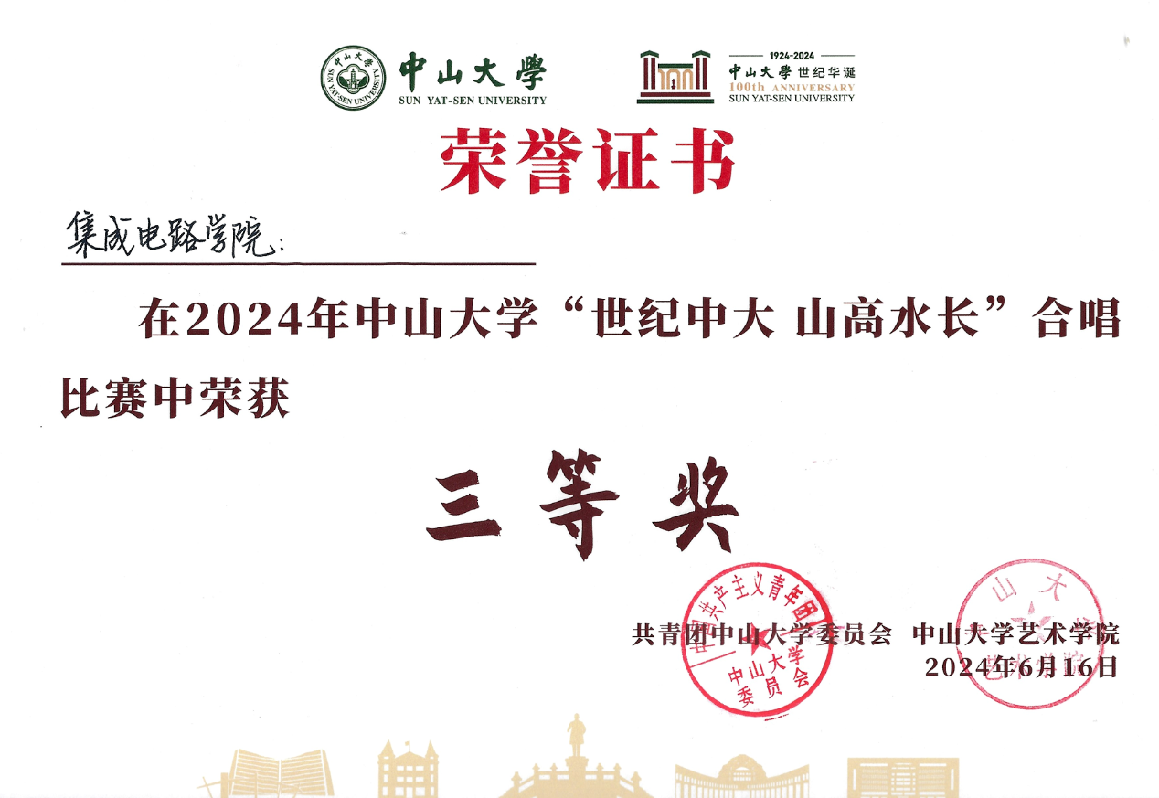 2024年6月16日,中山大学“世纪中大 山高水长”合唱比赛在广州校区南校园梁銶琚堂隆重举行。在集成电路学院直属党支部的指导和广泛动员下,由学院领导带队,学院青年学子和教职员工积极参加了此次合唱比赛,展现了我院师生昂扬朝气、奋发进取的精神面貌,最终获得合唱比赛三等奖。