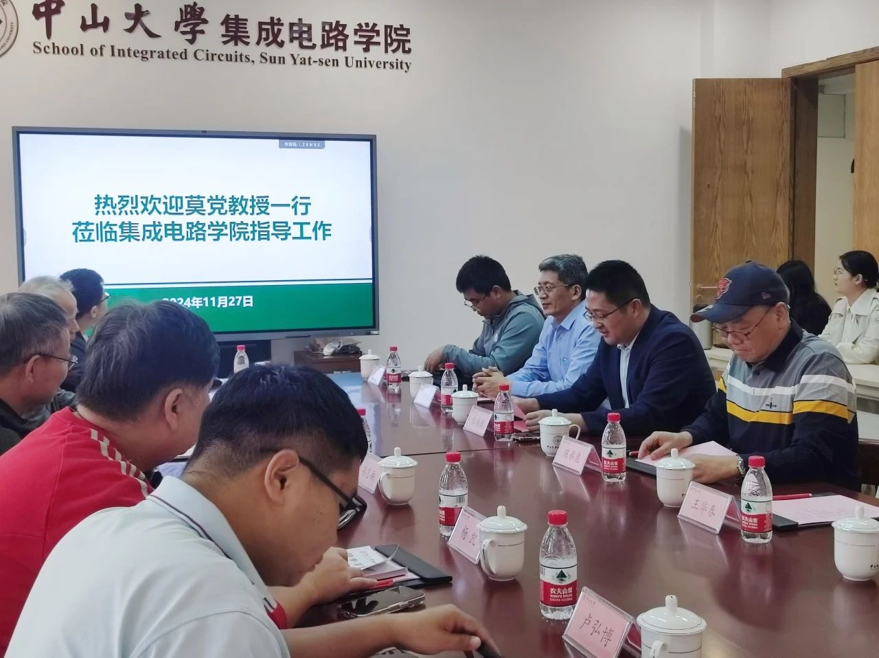 2024年11月27日下午17:00,原国家教委科技委员会物理组成员、广东省物理学会理事长、中山大学微电子研究所所长、中山大学物理系主任莫党先生莅临集成电路学院开展学术交流活动,作题为“中国及中山大学半导体学科发展历程回顾”的专题报告。交流座谈会由集成电路学院陈弟虎教授主持,中山大学深圳校区管理委员会常务副主任温光浩、集成电路学院直属党支部书记张尚武、航空航天学院党委书记罗愈业、理学院李志兵教授以及集成电路学院师生代表参加了此次交流座谈会。