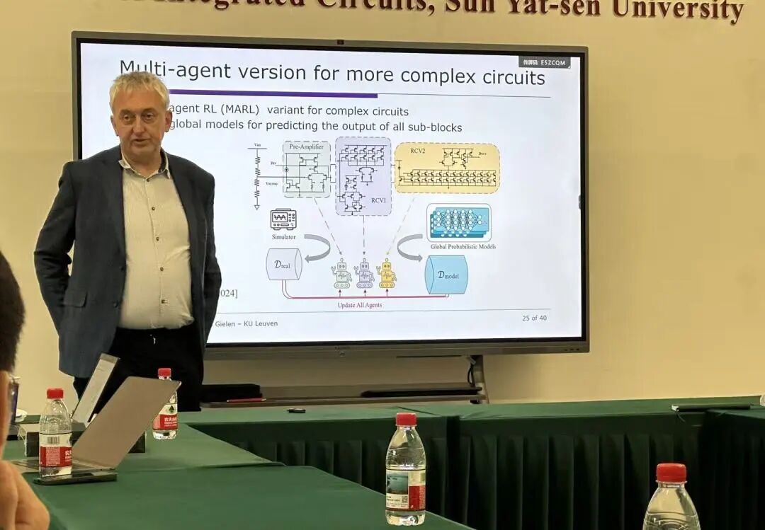 Georges Gielen教授向大家分享了运用先进机器学习(Machine Learning)技术实现模拟集成电路自动设计与布局的巨大潜力。Georges Gielen教授团队将基于模型的策略优化(MBPO) 与双延迟深度确定性策略梯度(TD3) 算法相结合,形成MBTD3算法;针对复杂电路(如多子模块电路),提出多智能体扩展的MA-MBTD3算法。相较于传统TD3算法,Georges Gielen教授团队在两个运放电路(两级运放、折叠共源共栅运放)和一个复杂数据接收器电路上进行了验证,结果显示MA-MBTD3和在更少的仿真和更短的时间内达到更优的FoM(品质因数)和更低的功耗/面积。这表明人工智能模型在高维、耗时昂贵的优化问题中具有显著优势,尤其适合复杂模拟电路设计,为基于强化学习的模拟电路自动化设计提供了更高效、可扩展的新途径。