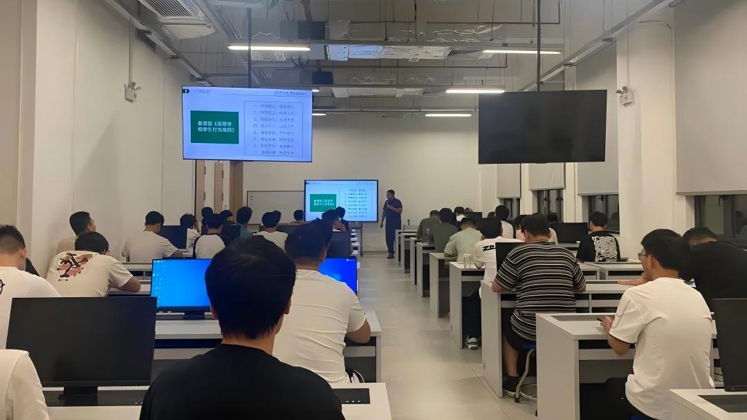 首先由苏晟老师为研究生新生做入党宣讲,详细介绍了入党的基本流程和重要意义,鼓励新生积极向党组织靠拢并在思想上追求进步。接着,余晓坤老师就新学期的课程安排、研究生学籍和培养管理等内容进行了全面介绍,并着重强调了学风建设、保密管理等方面的要求。卢弘博老师为同学们介绍了新生入学阶段的安排和注意事项,并进行了纪律教育和安全教育,涵盖了校规校纪解读、国家安全、宿舍用电安全、实验室安全、预防电信诈骗以及民族宗教政策介绍等重要内容。最后,提高同学们的消防安全意识,帮助同学们掌握火场逃生技巧,卢弘博老师带领全体参会同学从应急逃生路线撤离会场。
