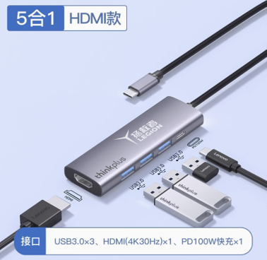 5合1接口含HDMI(4K输出)、3×USB3.0及PD100W快充,铝合金机身防刮抗指纹 。即插即用兼容PC/手机/平板。